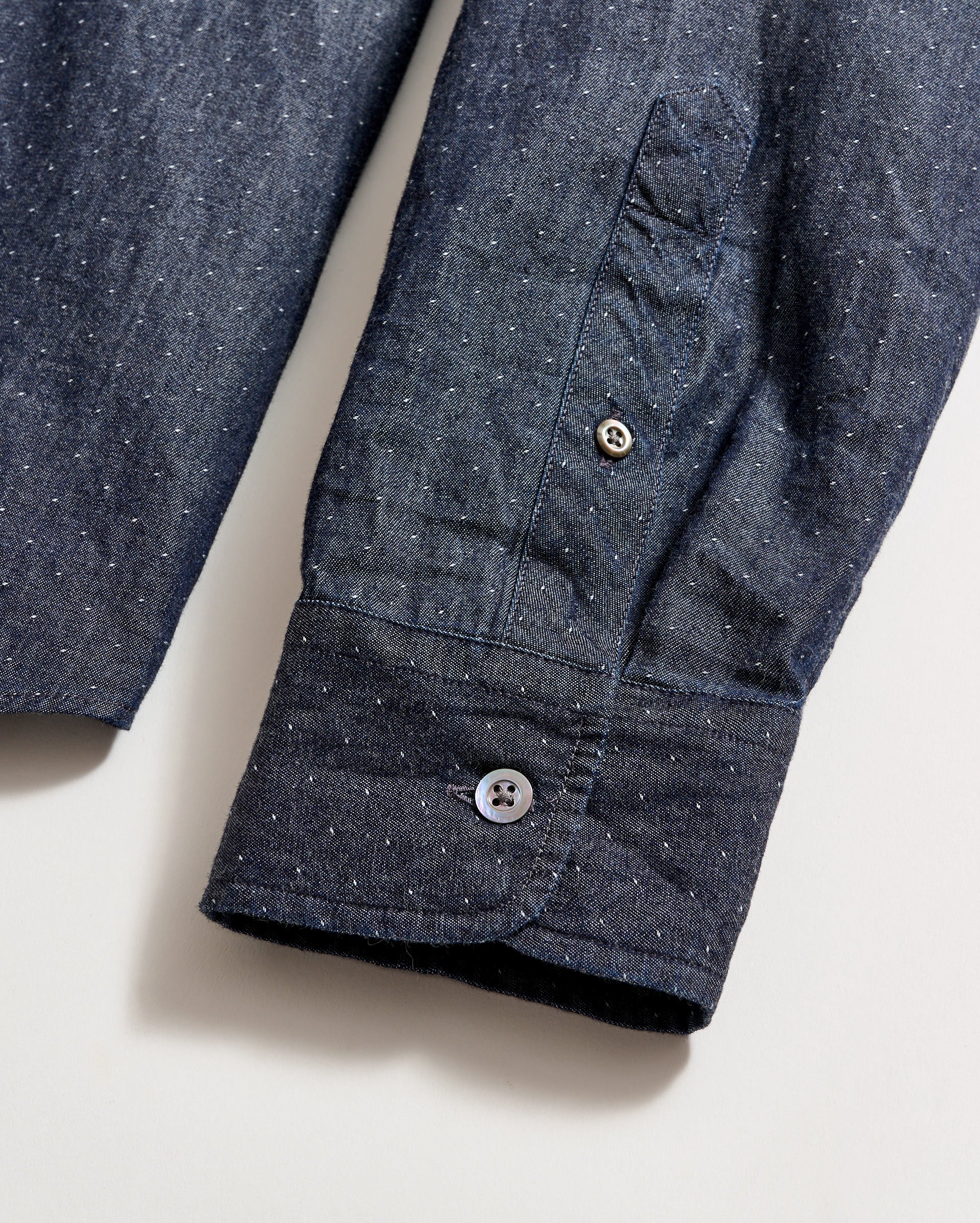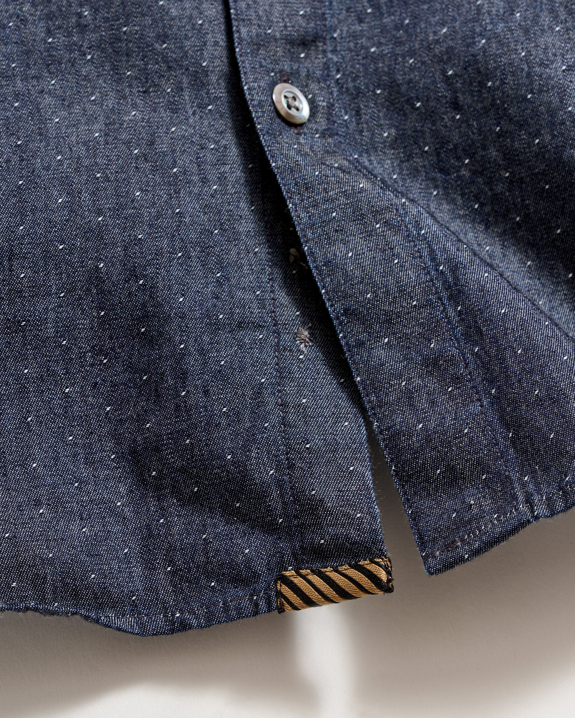 This classic shirt silhouette is one that we’re bringing back in new fabrics and colorways. It features two hidden button-down collars, a split straight bias yoke, barrel cuffs, and a tonal thread throughout the body. It has a classic looking feel for a button down in a standard fit that looks great on its own, worn open, or layered under a blazer. We’ve finished the shirt with 18 line buttons and our signature Billy Reid heritage stripe at the front placket.