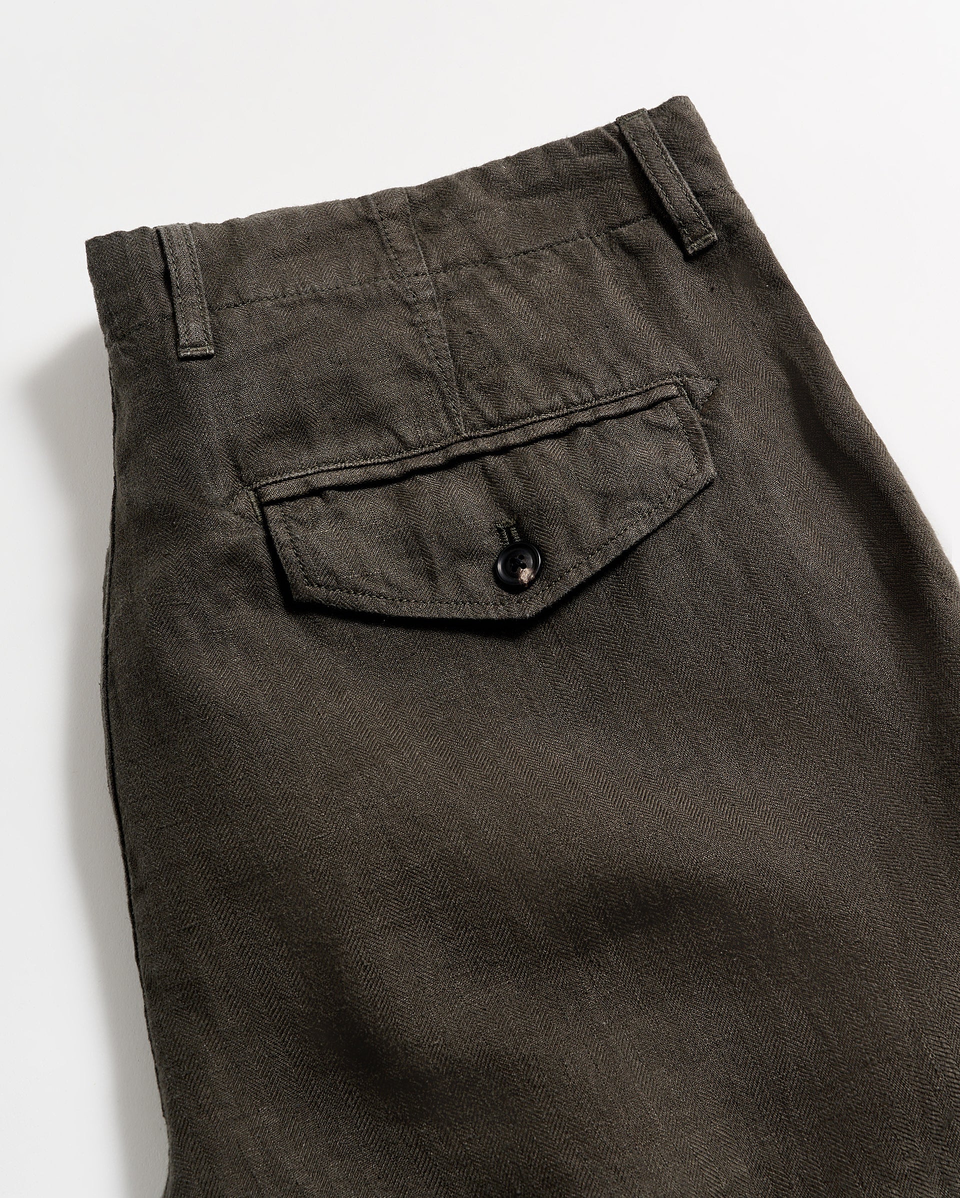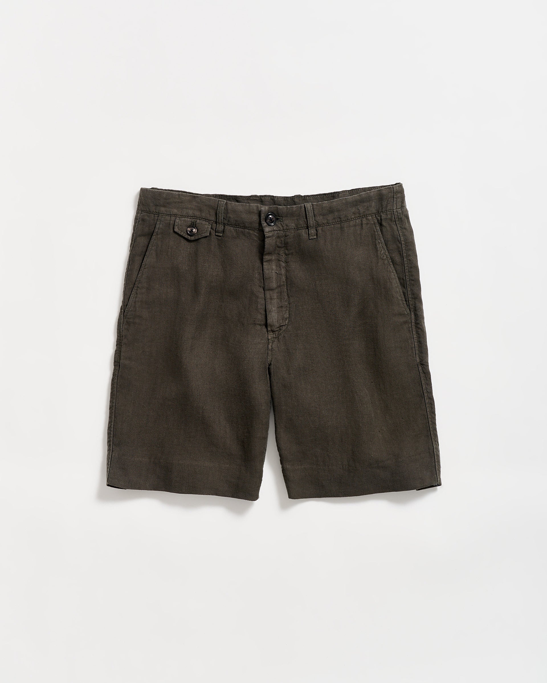 This lightweight short is crafted from garment-dyed linen with a subtle herringbone pattern, and finished with thoughtful details like a coin pocket at the right waist and horn buttons throughout. Can be dressed up or down with ease.