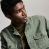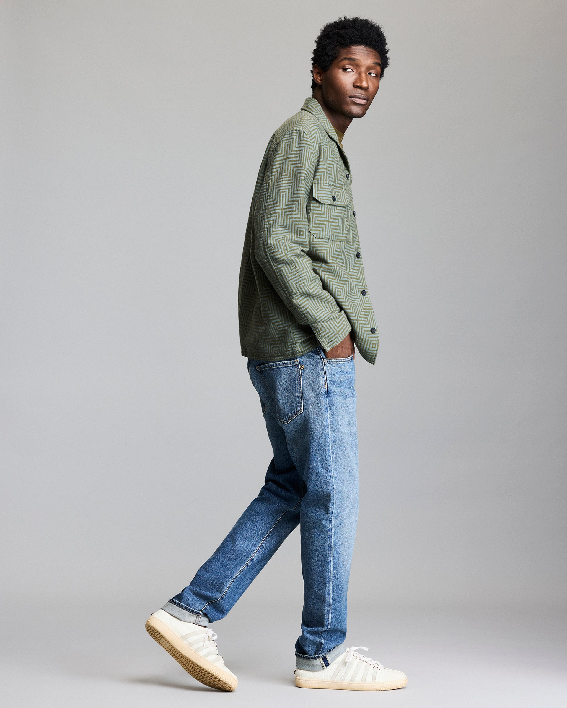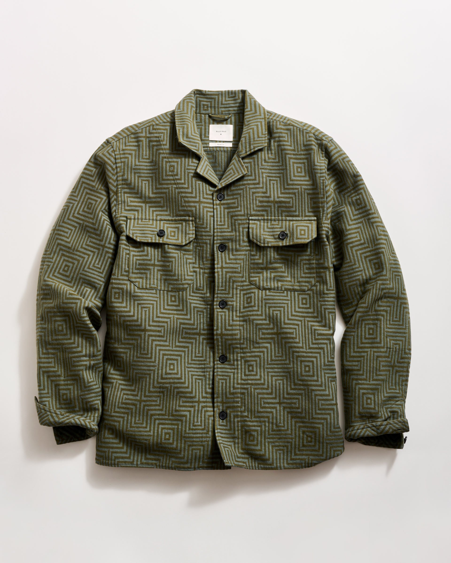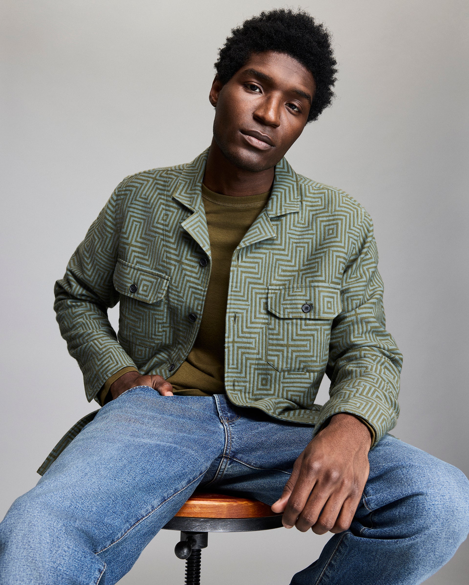 A luxe upgrade to the essential overshirt, this piece features a custom woven jacquard, featuring our seasonal Optical Illusion pattern, inspired by a handknit sweater. Crafted with a lightweight cotton in and a timeless camp collar in a relaxed fit, this layering piece looks smart over your favorite t-shirt or as an unexpected choice for a dressier look. Finished with refined details like top-stitched elbow patches, and antique brass snaps and tonal thread throughout.
