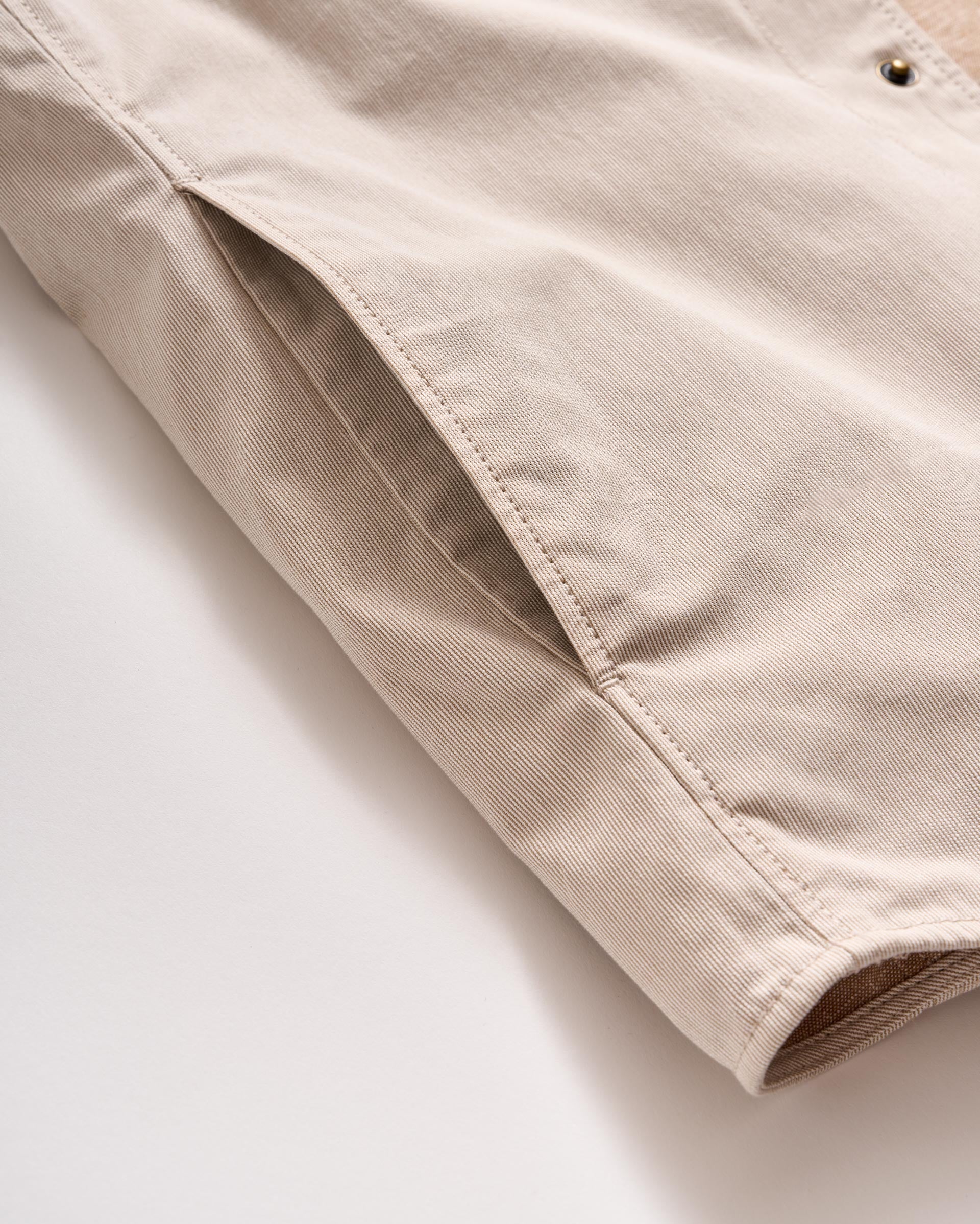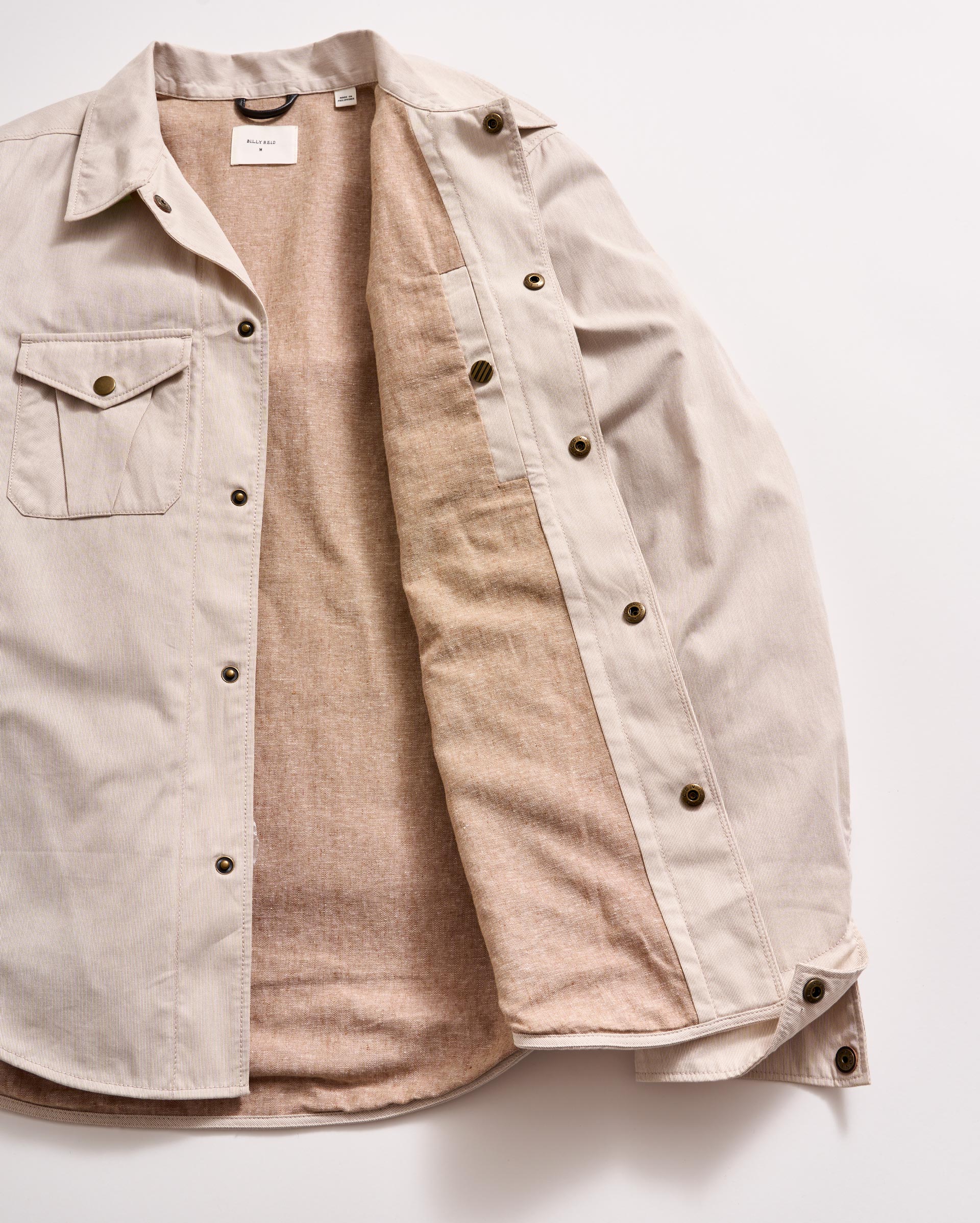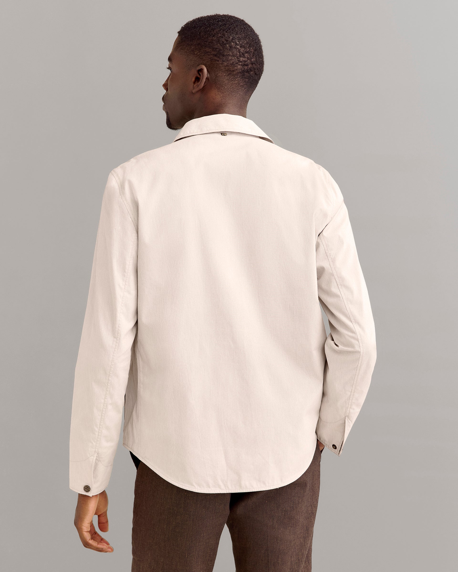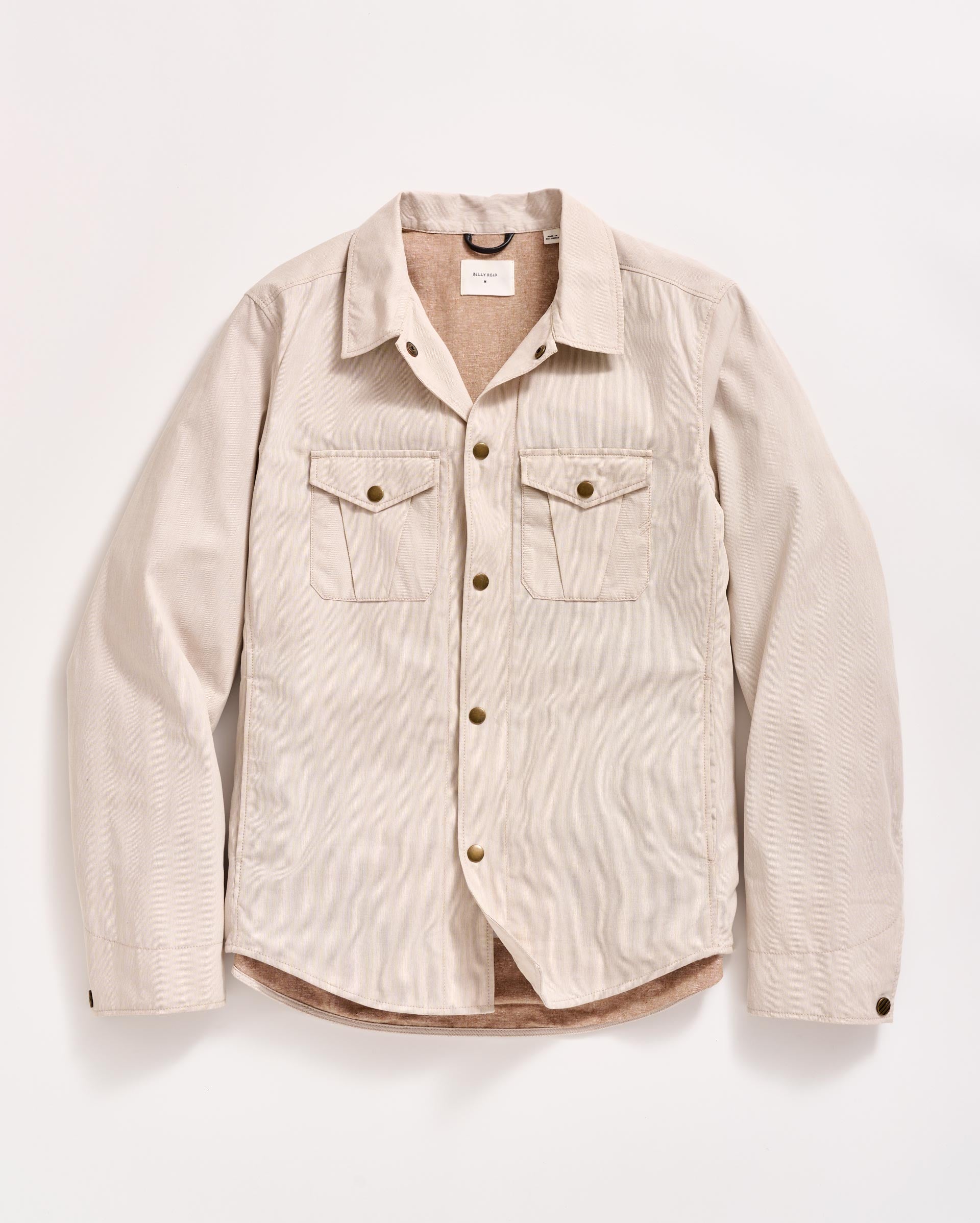 This classic shirt jacket is the perfect closet staple to pull over any look this season. The cotton linen fabrication breathes easily in the warm weather and the relaxed style will pull on easily over any look. The light pincord fabric also gives the jacket a water resistant finish. It’s finished with Billy Reid signature details like snap closures, a leather locker loop, and our heirloom ribbon strip clamshell at the back neck.