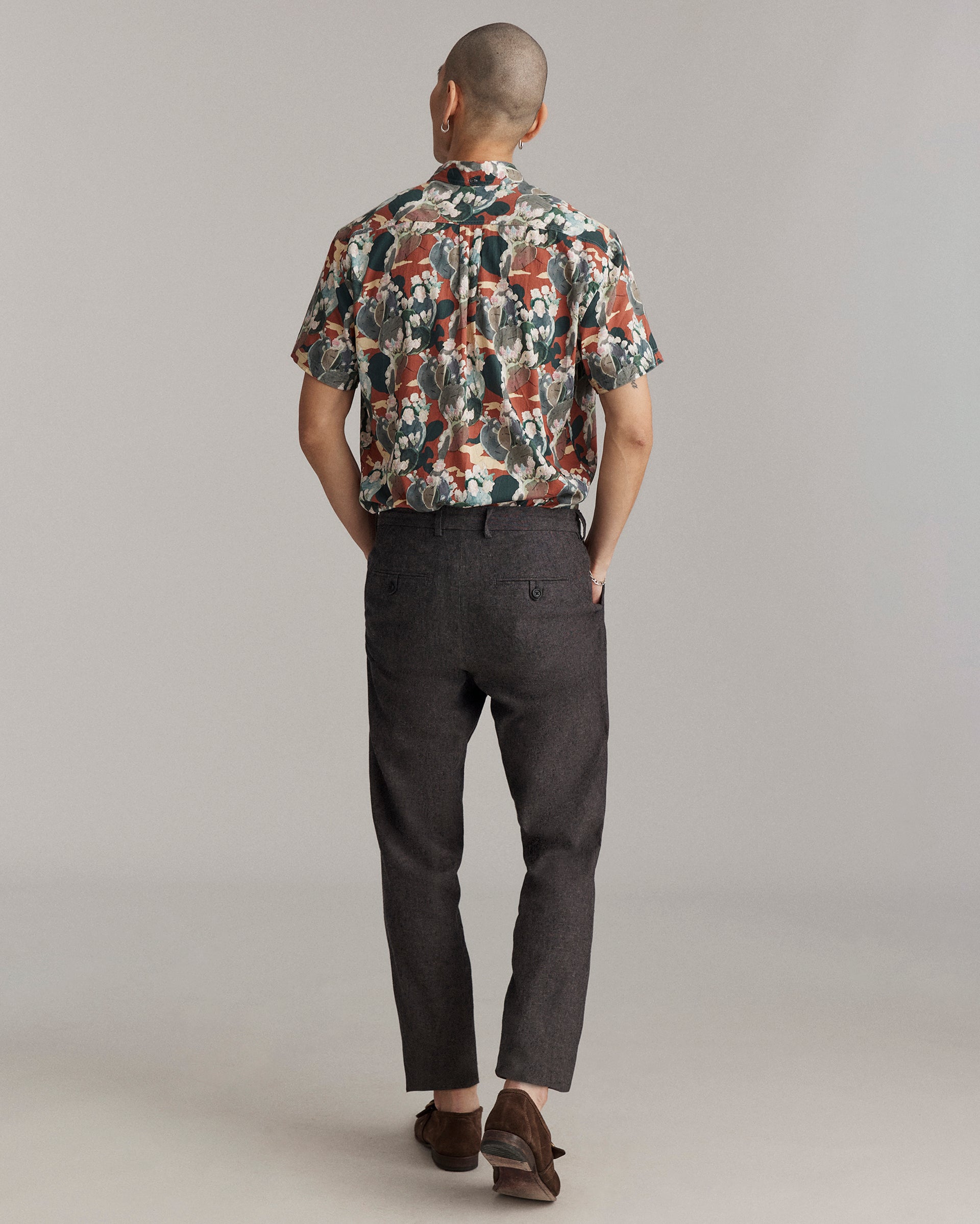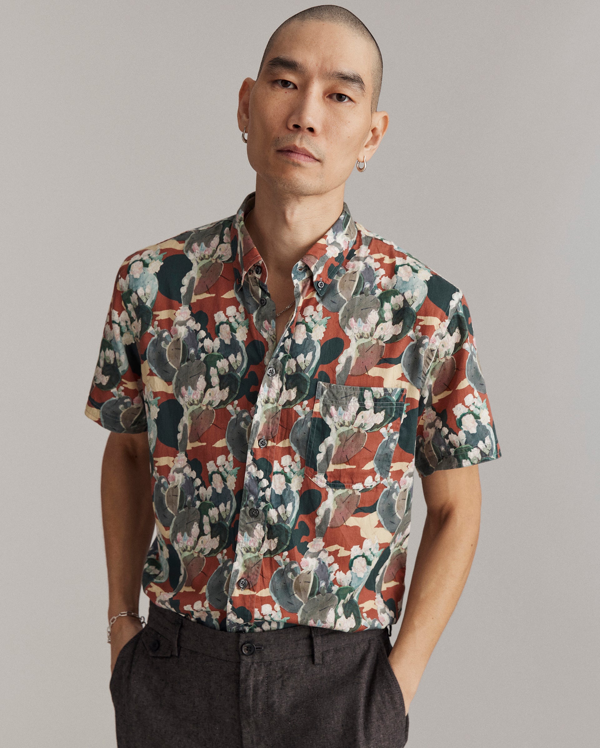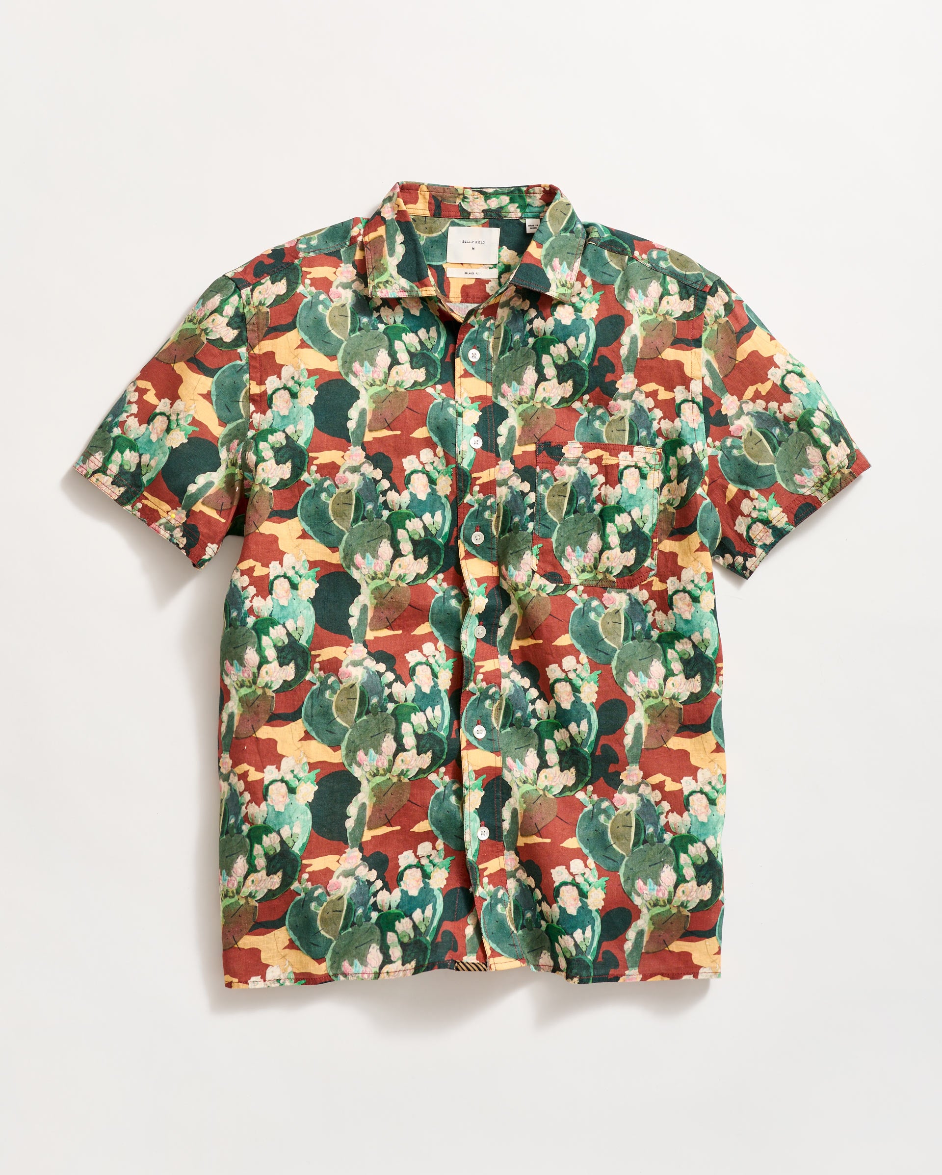 Liven up your summer style with a shirt that pairs a classic silhouette and shape with a custom artwork that dresses up or down. The unique colorway is sure to turn heads, whether you’re wearing it on its own to a barbeque or layering it under a dark suit to make a statement. The 100% linen style is a revived archive style that also breathes easily in the summer heat, making it the go-to shirt for the season.