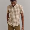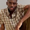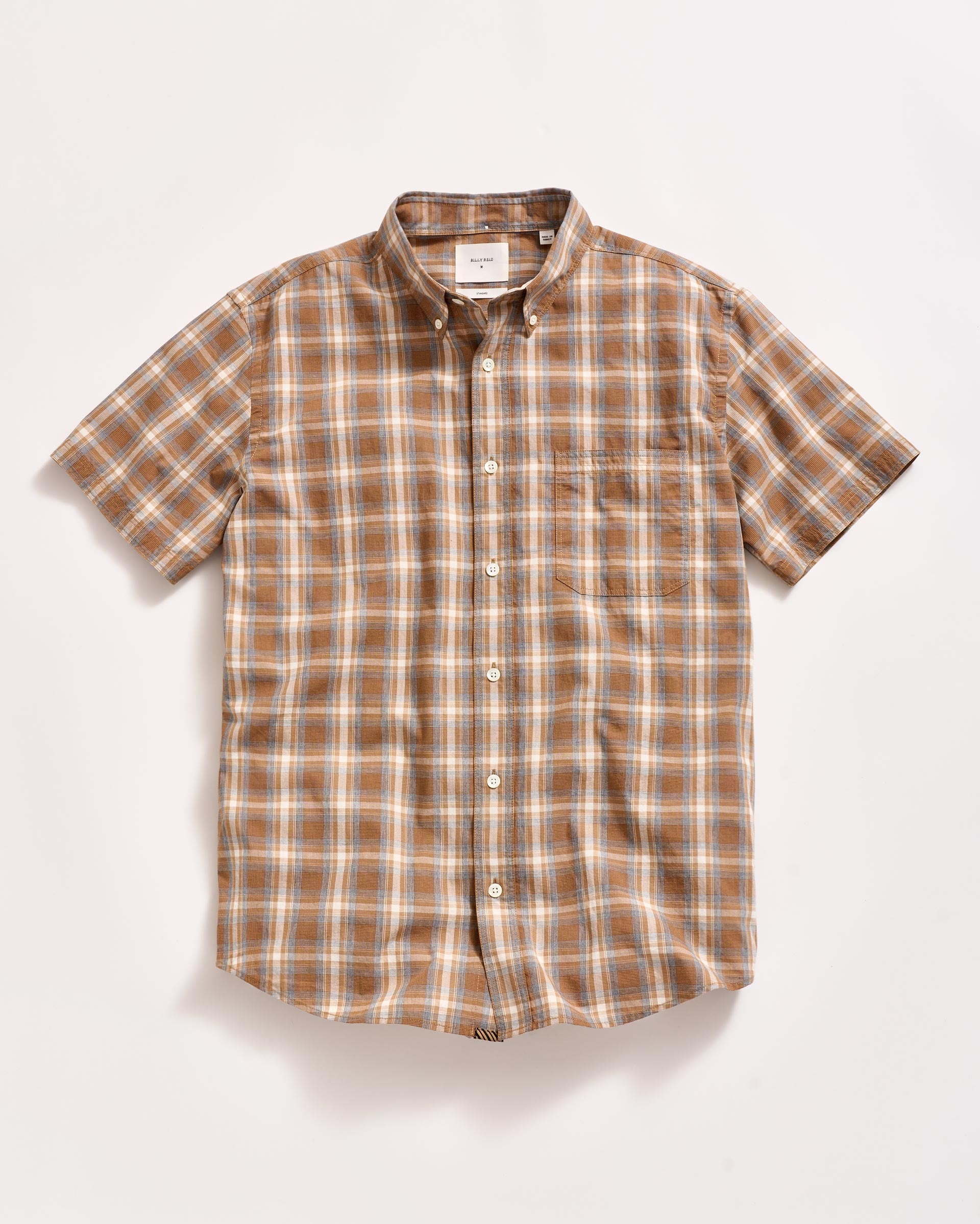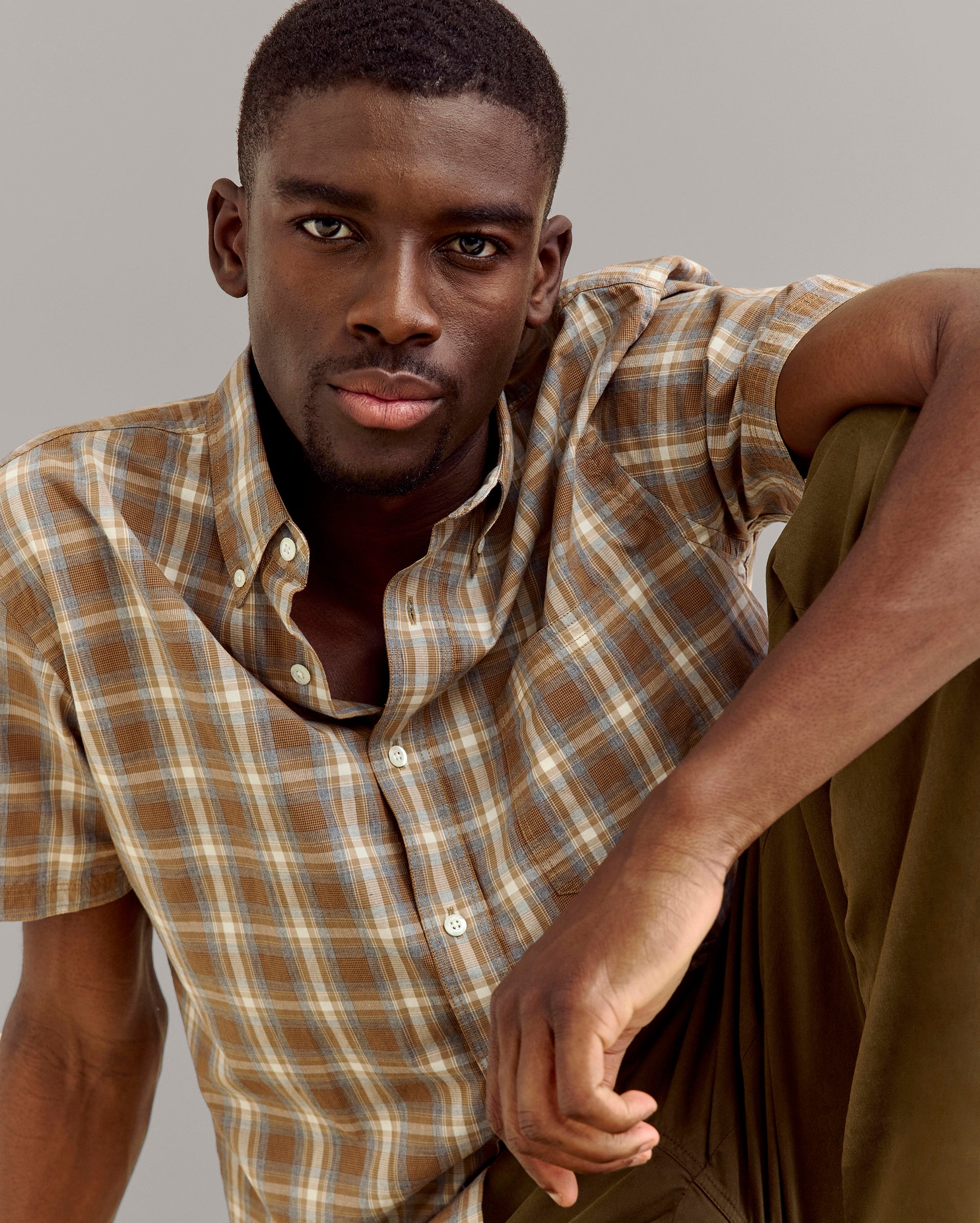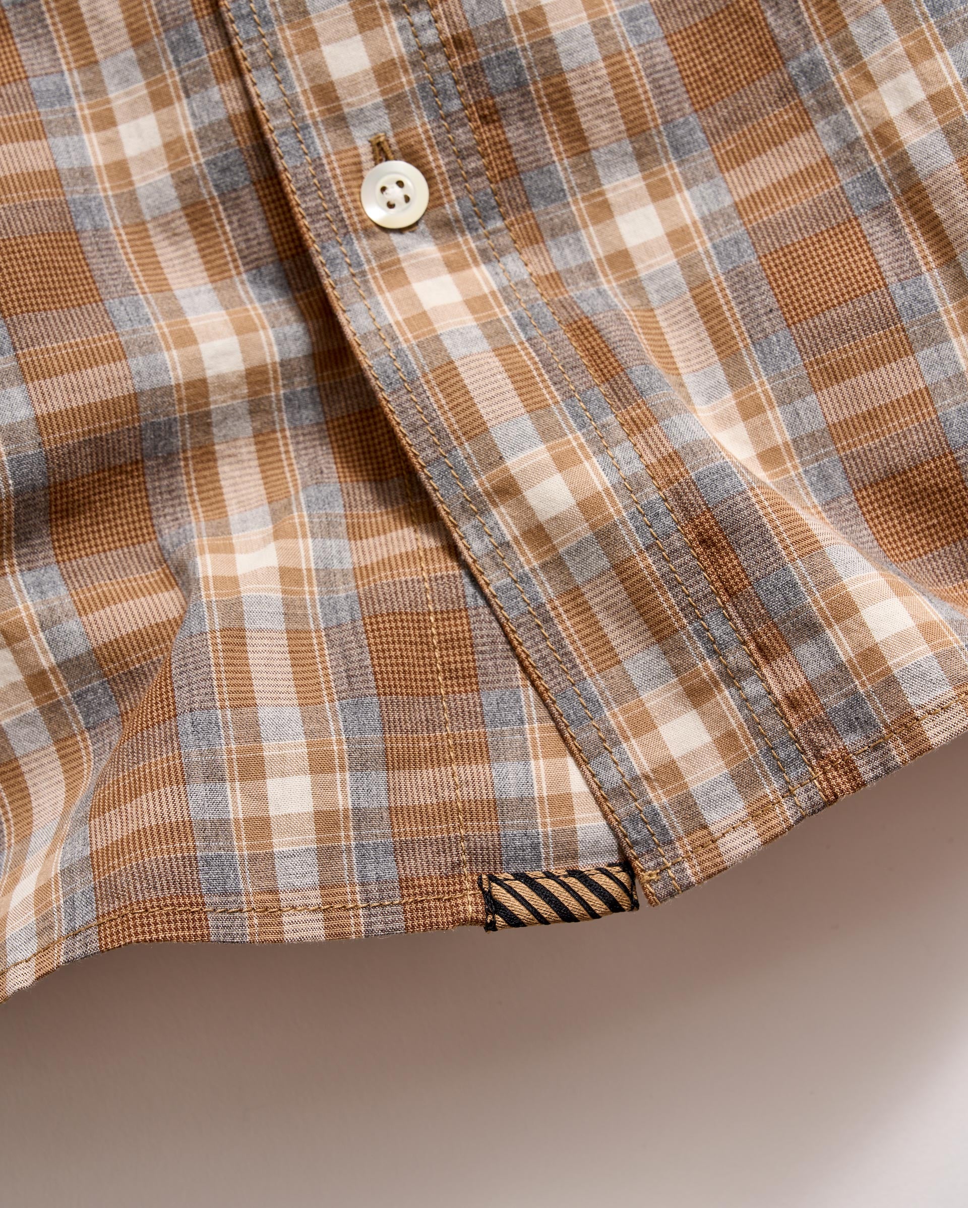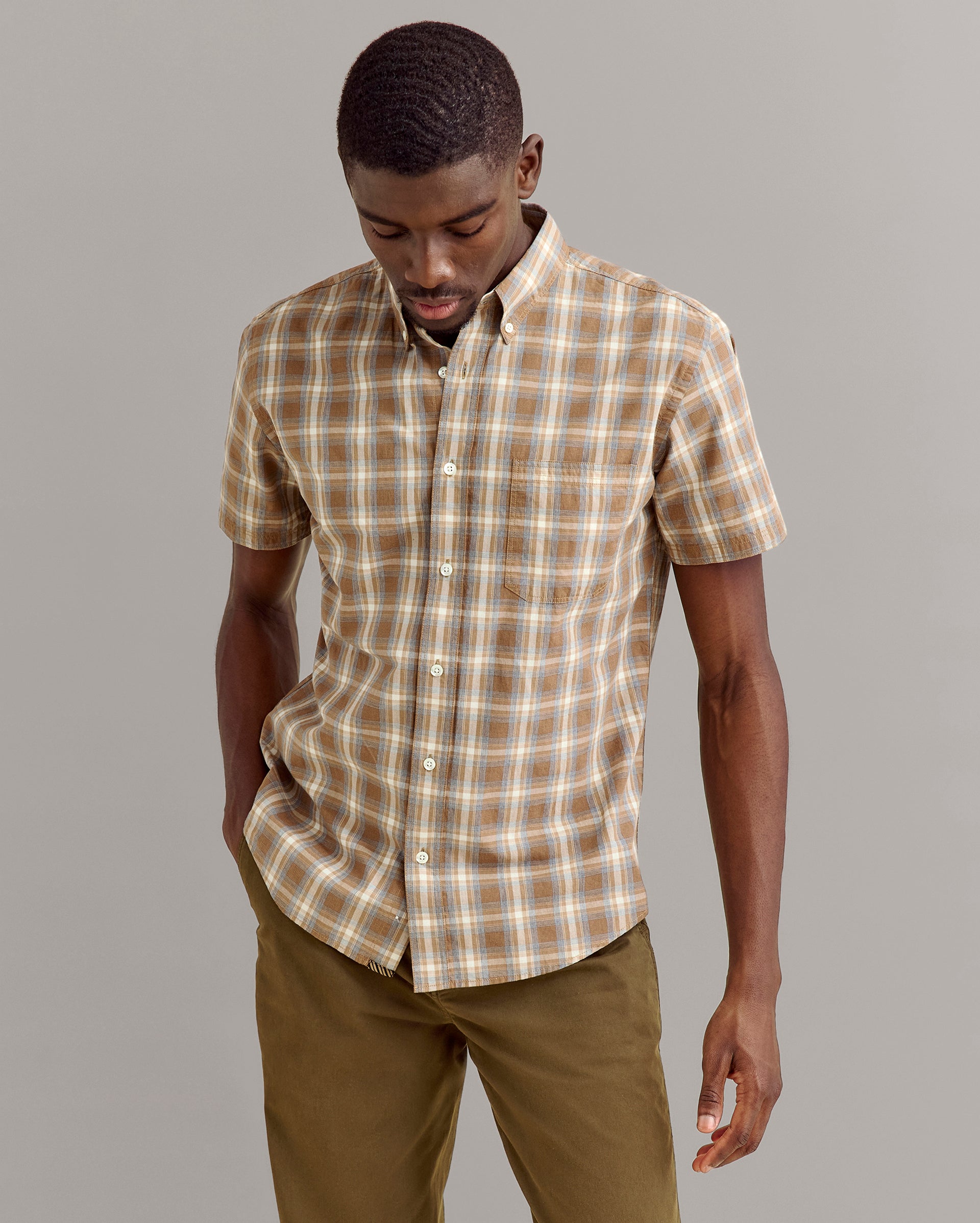 Our best-selling Tuscumbia shirt is the cornerstone of lived in luxury. This short-sleeve version is cut from 100% cotton and features a melange plaid pattern, giving it a lived-in look and feel. It’s constructed in a standard fit and features a button-down collar, our signature notch pocket with double-needle stitching, and a box-pleated body. Thoughtfully finished with genuine mother-of-pearl buttons and a subtle detail: our heirloom ribbon applied to the bottom of the under placket.
