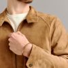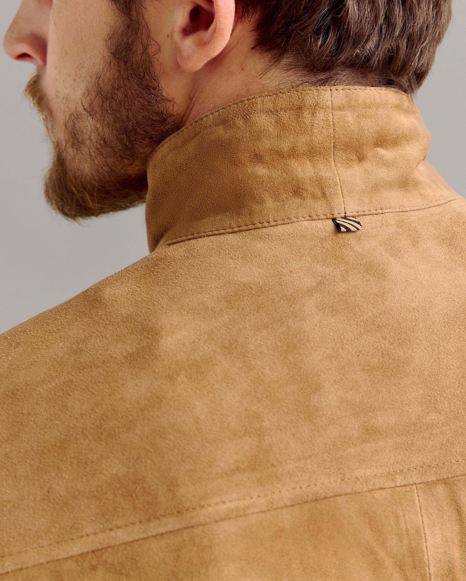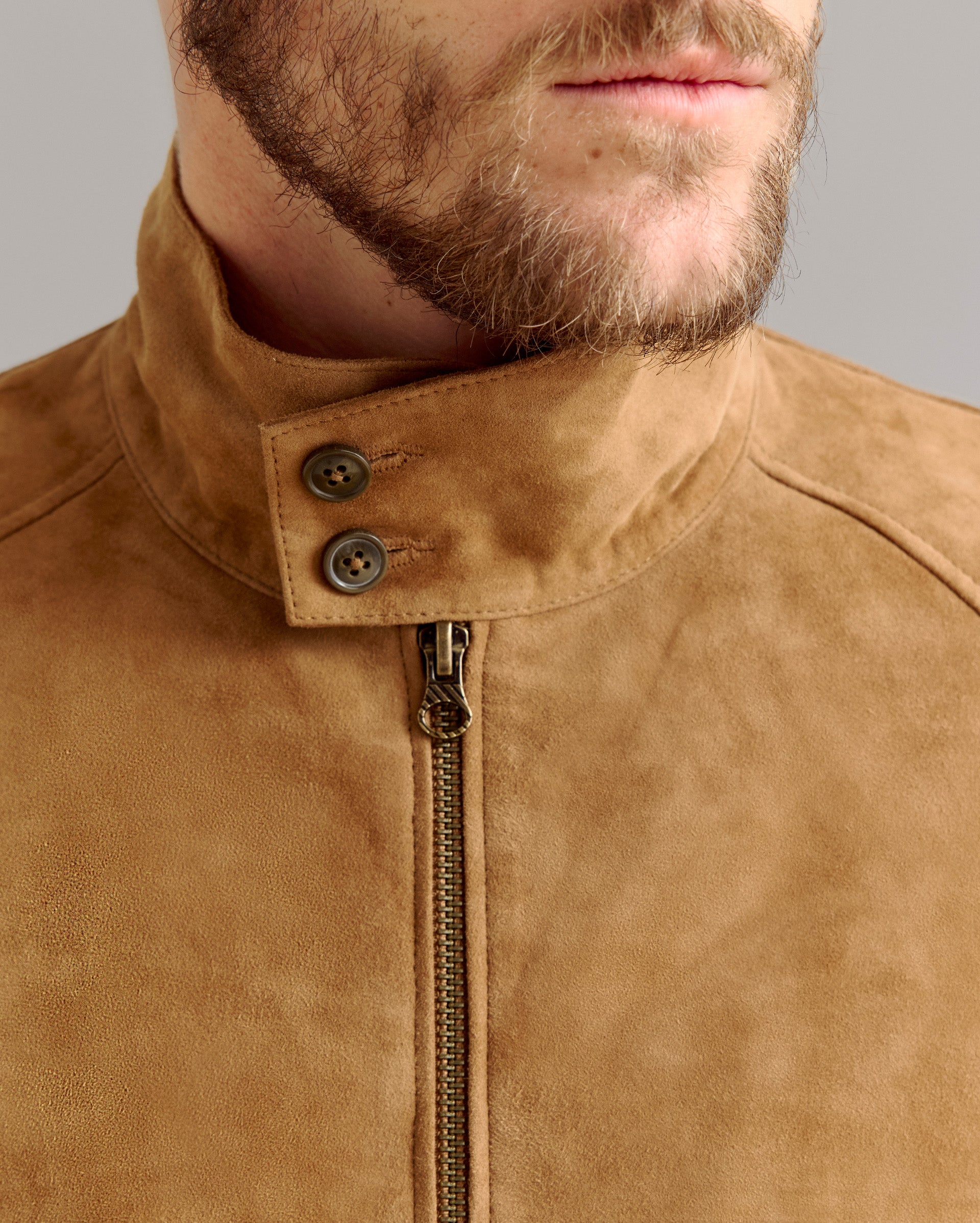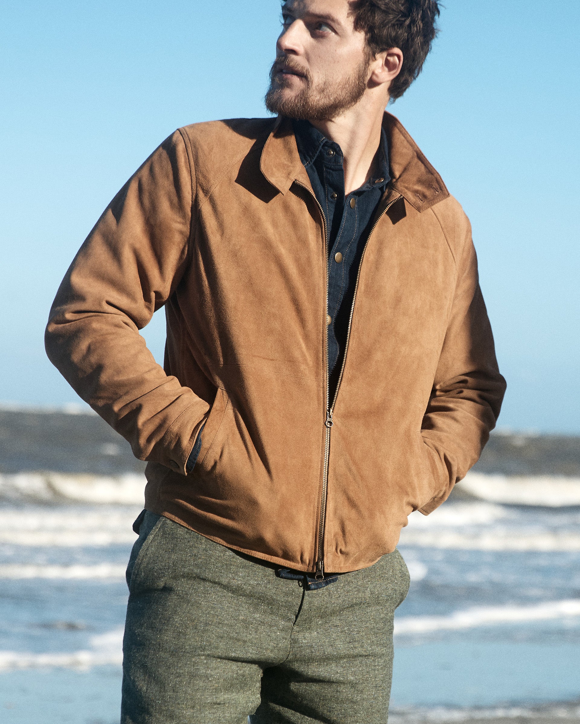 We’ve taken this classic style and reimagined it with luxe materials. The body is crafted from 100% goat suede and made with a glove suede weight. The result is a shorter framed piece that falls just at the hip. It’s an easy coat to wear to dress up an otherwise everyday outfit. The harrington style pairs well with a simple tee and jeans or worn with trousers and a button-down.