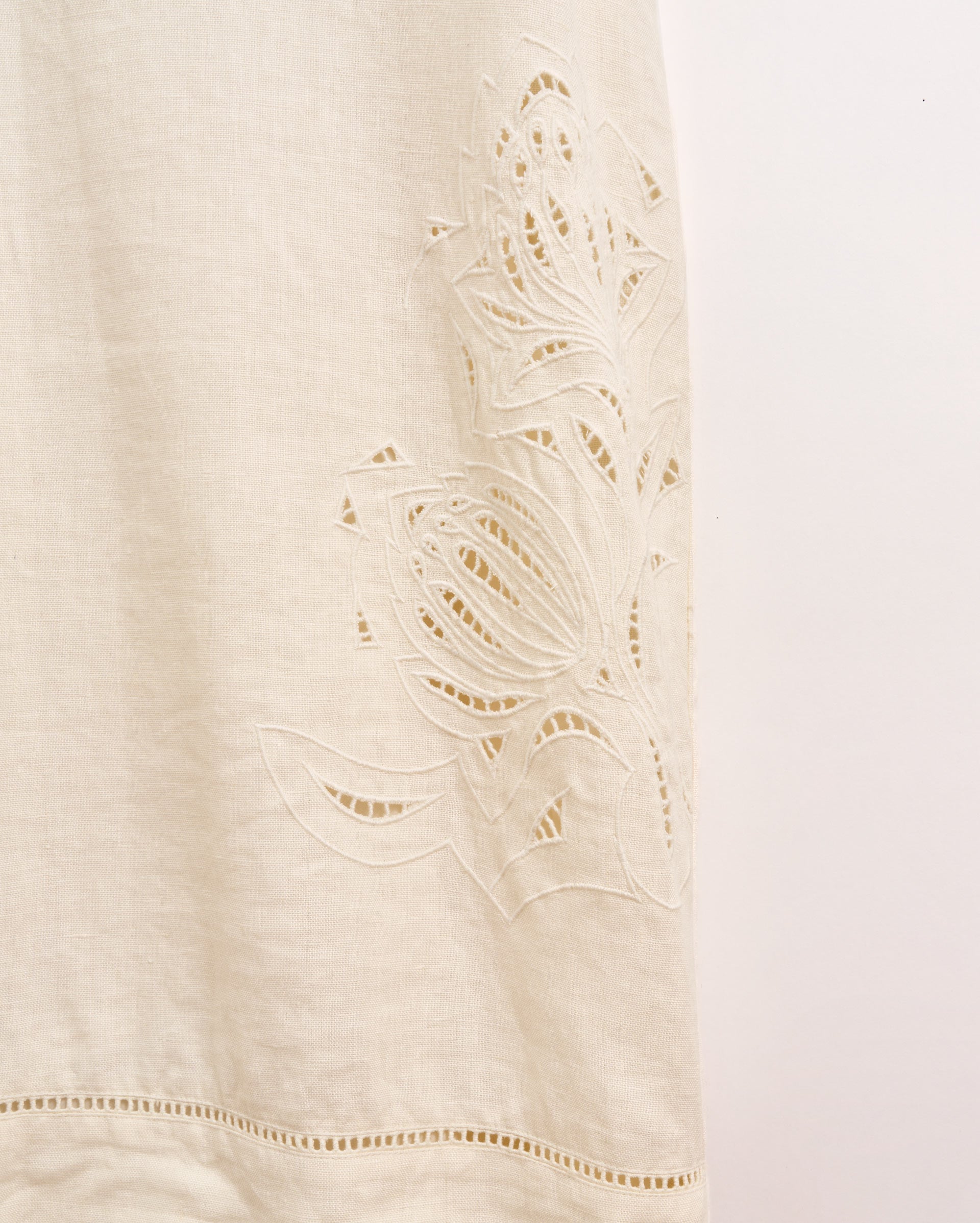 This simple dress will quickly become one of your spring style staples. The 100% linen fabric has a lovely pointelle design embroidered into it at the sleeves and at the hem of the neck. A protea flower motif at the right shoulder and left side complements the look as a modern take on the white eyelet dress. It’s our take on the ubiquitous white summer eyelet dress—built to go anywhere you do.