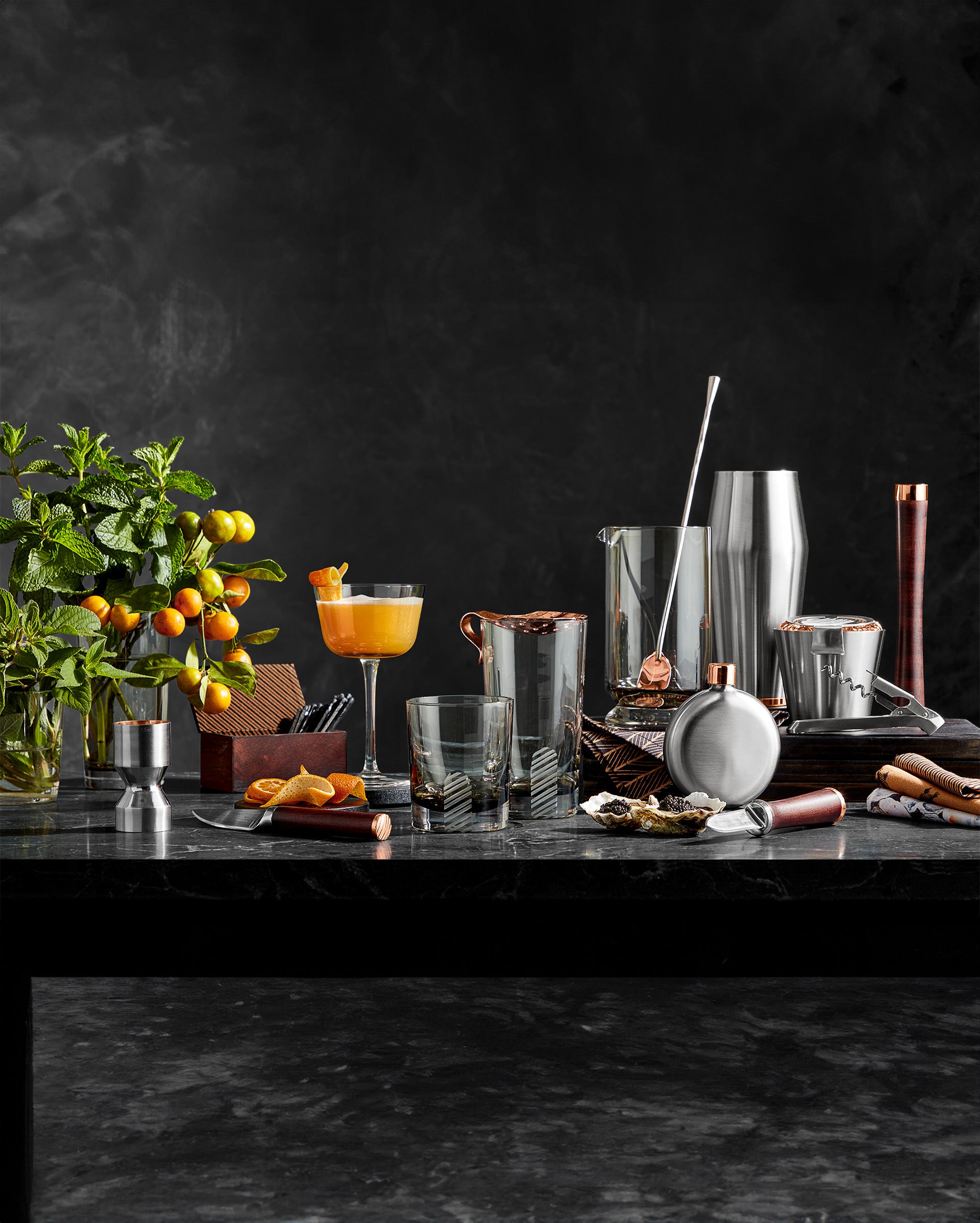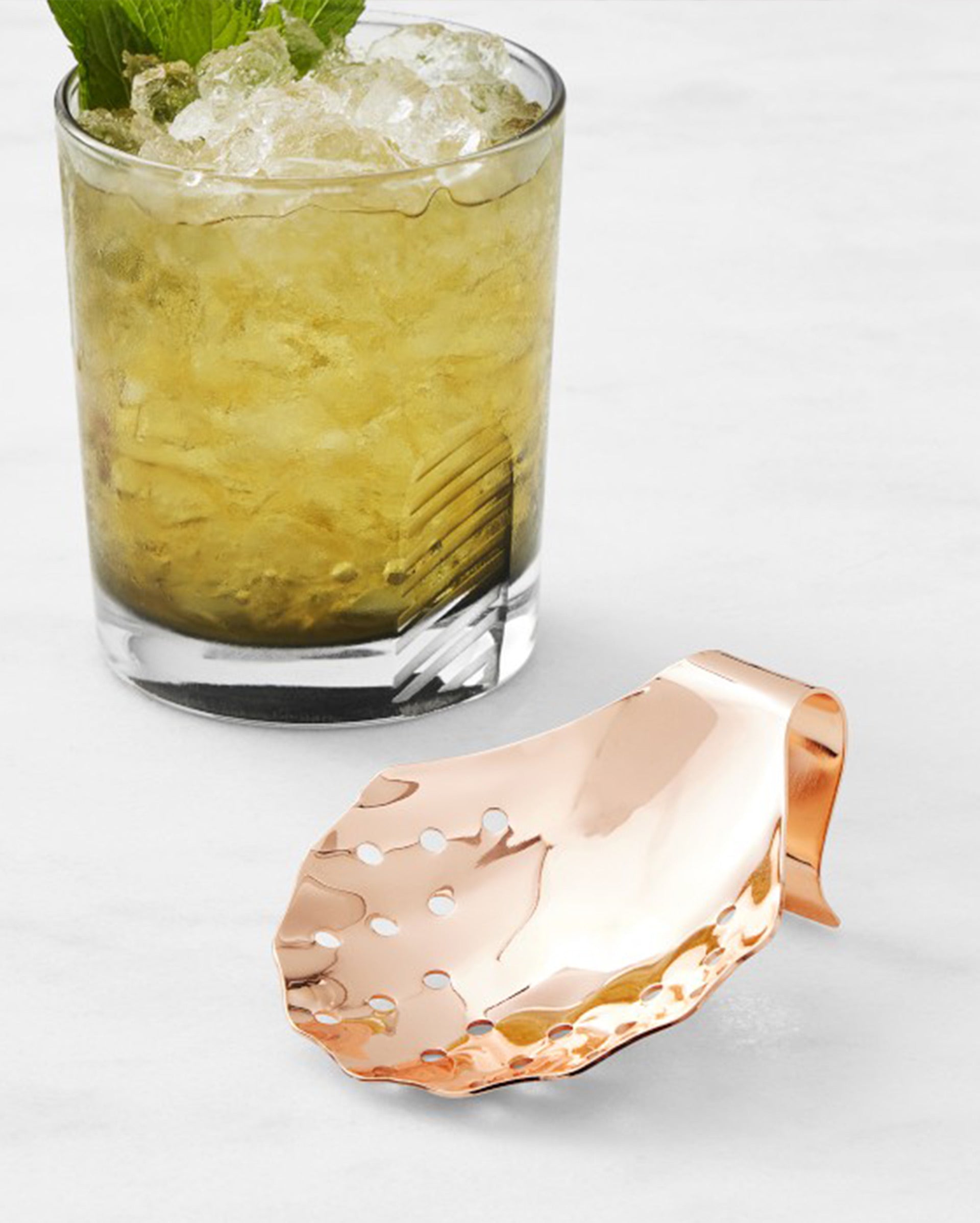 Upgrade your next cocktail hour with exclusive glassware and tools from our collab with Williams Sonoma. This julep strainer is made of corrosion-resistant stainless steel and elevated with a copper-plated finish. It features perforations that allow easy straining and a handle that hooks onto the rim of a mixing glass.