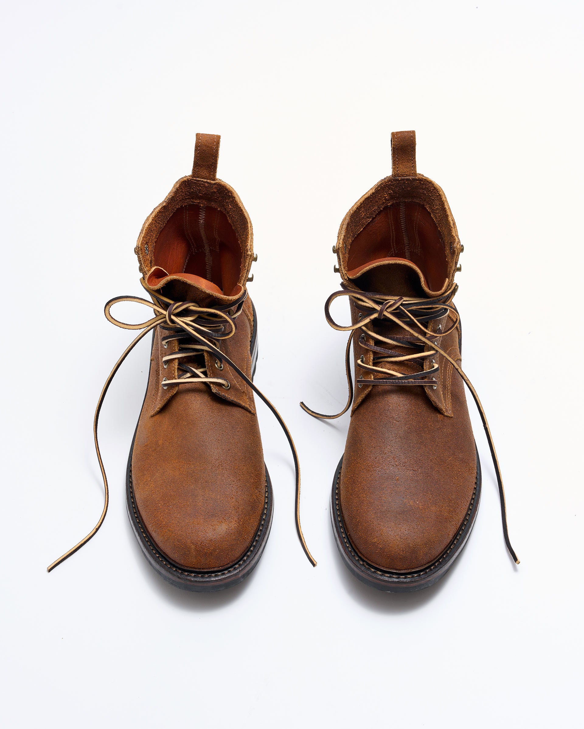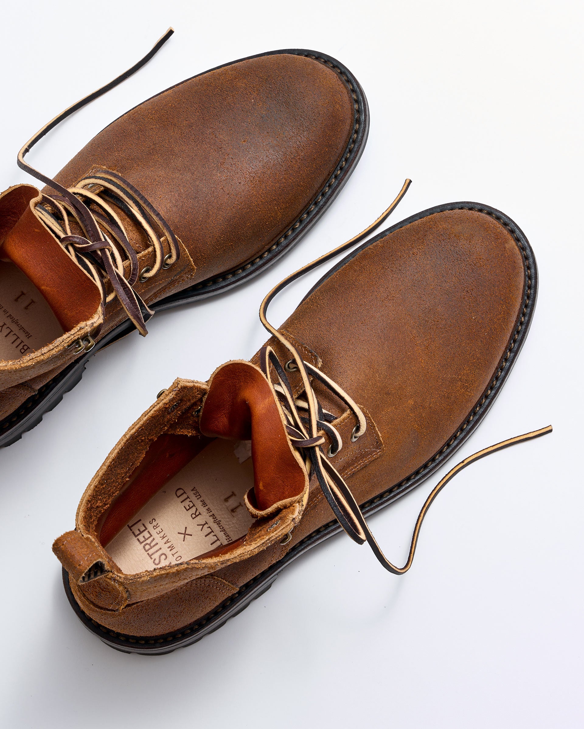 The Oak Street Bootmakers × Billy Reid Trench Boot combines the classic silhouette of a heritage military officer’s boot with the rugged charm of a gentleman’s hunting boot. Made entirely in the USA from waxed full-grain roughout leather with a character that only improves with age—and soft but durable commando rubber soles—the result is something new yet familiar, with a timeless versatility suitable for wear with everything from denim to chinos to tailored trousers. But despite its ability to step into a casual role, this Trench Boot is made to the standard of the finest dress shoes with hand-lasted Goodyear Welt construction so that it can be resoled again and again and backed by Oak Street Bootmakers’ Factory Guarantee. Based on the WWI US Army M1917 Boot. True Goodyear Welt construction, hand-lasted with Barbour® Storm Welt. Calfskin vamp lining with